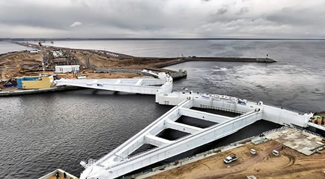 Сооружение предназначено для пропуска морских судов в течение всего года. Ширина судоходного пролёта 200 м, глубина воды на пороге 16 м.