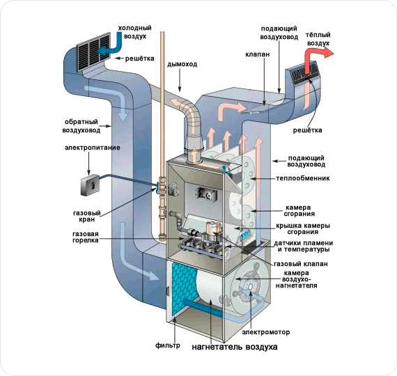 При воздушном отоплении происходит непосредственный нагрев воздуха, распределяемого по помещениям. Основным элементом системы воздушного отопления коттеджа является воздухонагреватель (теплогенератор). Он работает на газе или дизельном топливе. Тепло, получаемое при сжигании топлива в горелке, передается в теплообменнике воздуху, нагнетаемому вентилятором. После очистки в фильтре горячий воздух поступает в отапливаемое помещение по воздуховодам. Продукты сгорания газа удаляются в атмосферу через дымоходы из стали. Забор остывшего воздуха из помещения для его последующего нагрева в печи нагревателя обеспечивает система возвратных воздуховодов. Таким образом, достигается рециркуляция воздуха в помещениях. При необходимости с помощью открытия специальных заслонок часть воздуха может забираться с улицы. Это обеспечивает вентиляцию помещений.
