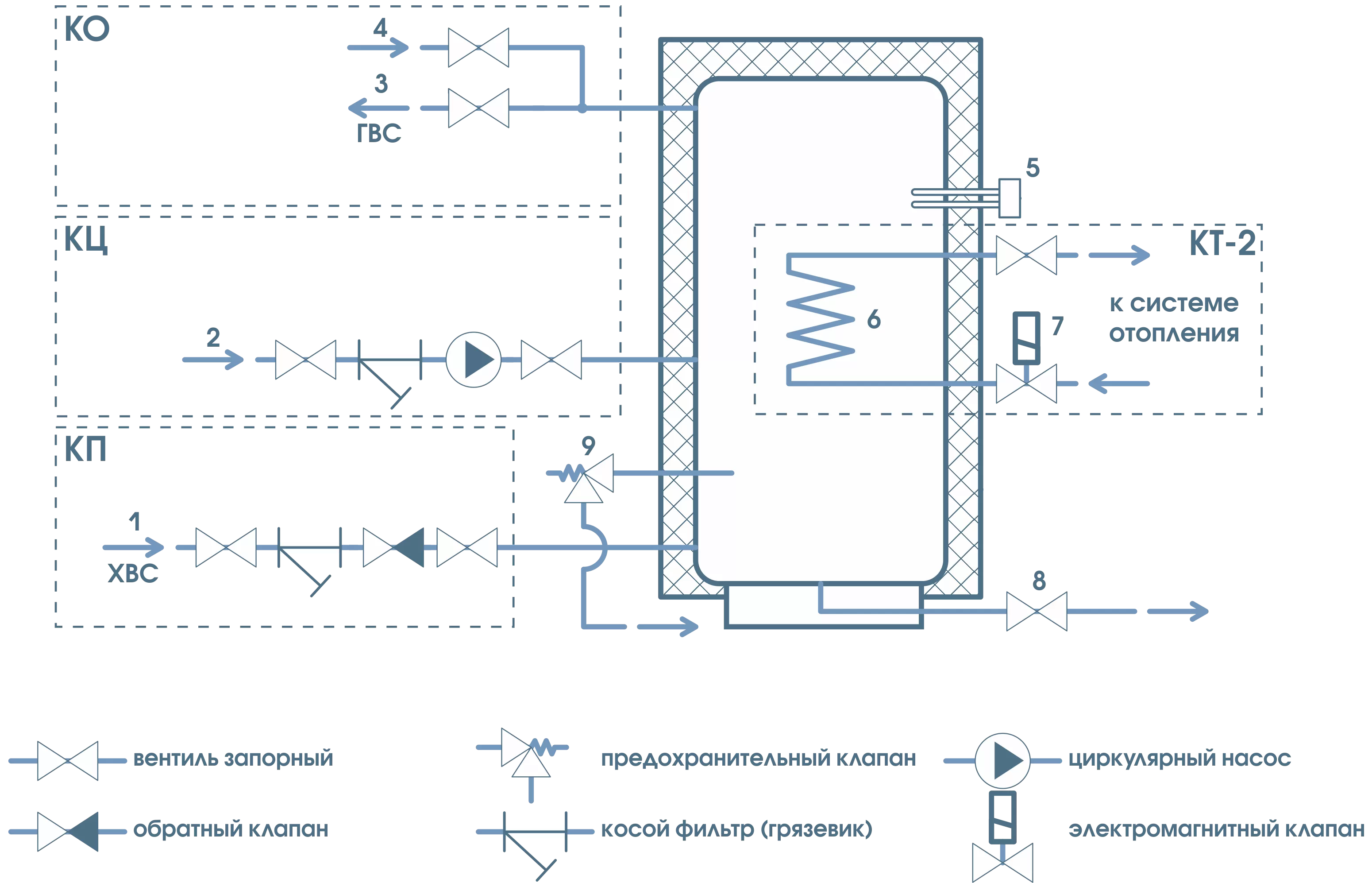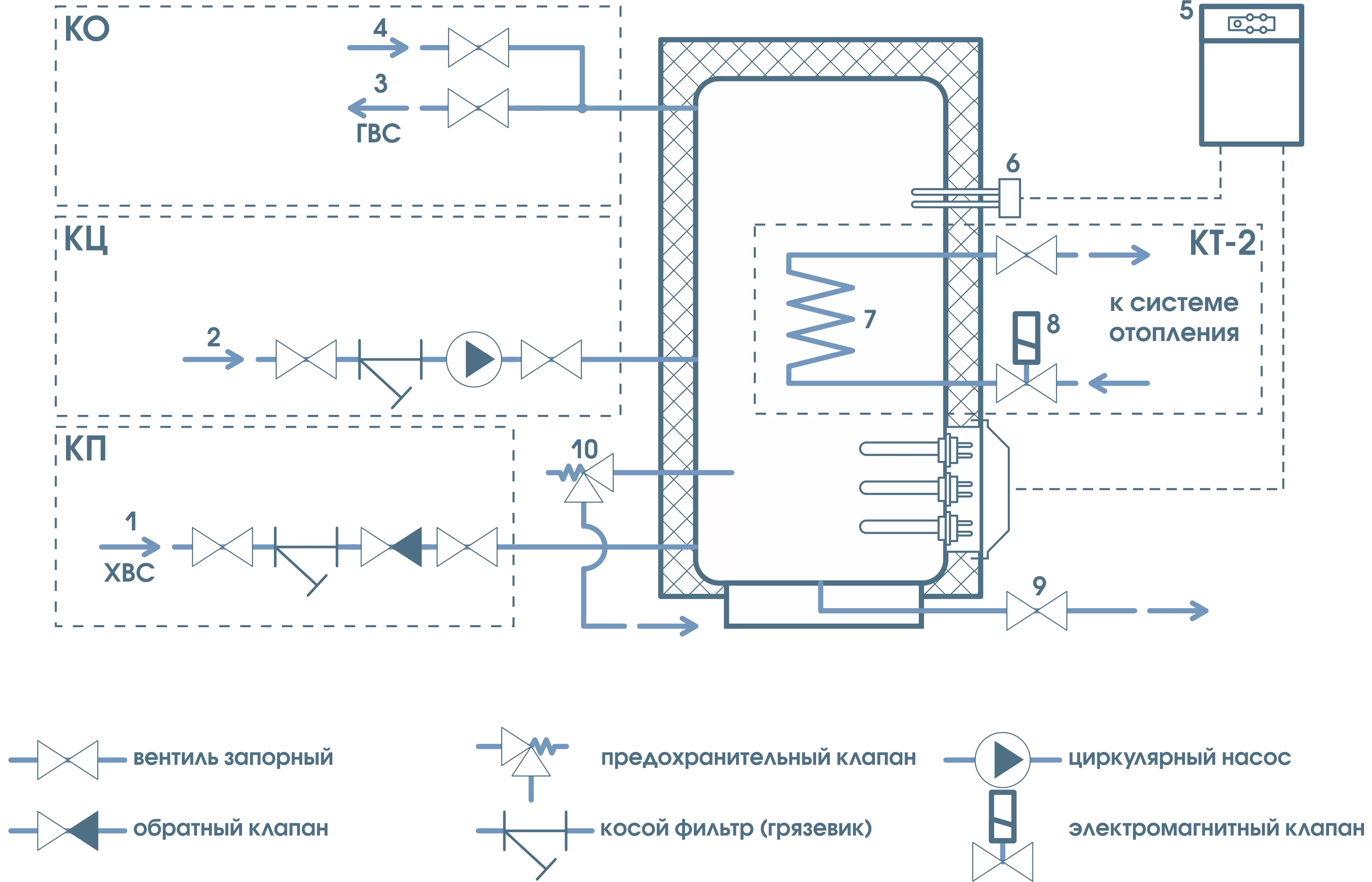 Схема обвязки водонагревателя со встроенным ТО Схема обвязки водонагревателя со встроенным ТО Схема обвязки водонагревателя с внутренним ТО ТЭНами Схема обвязки водонагревателя с внутренним ТО ТЭНами